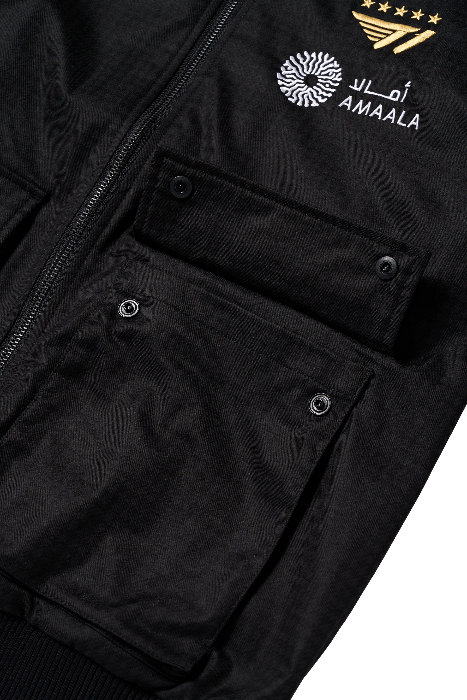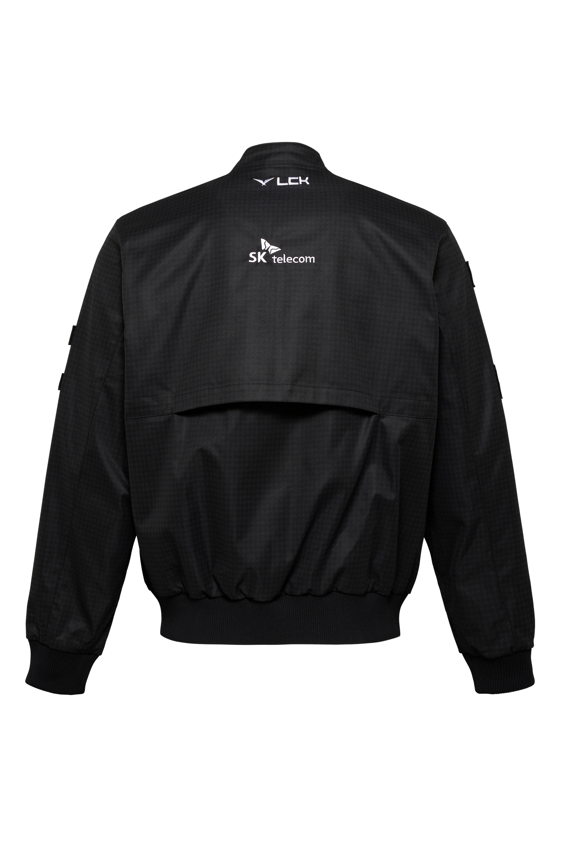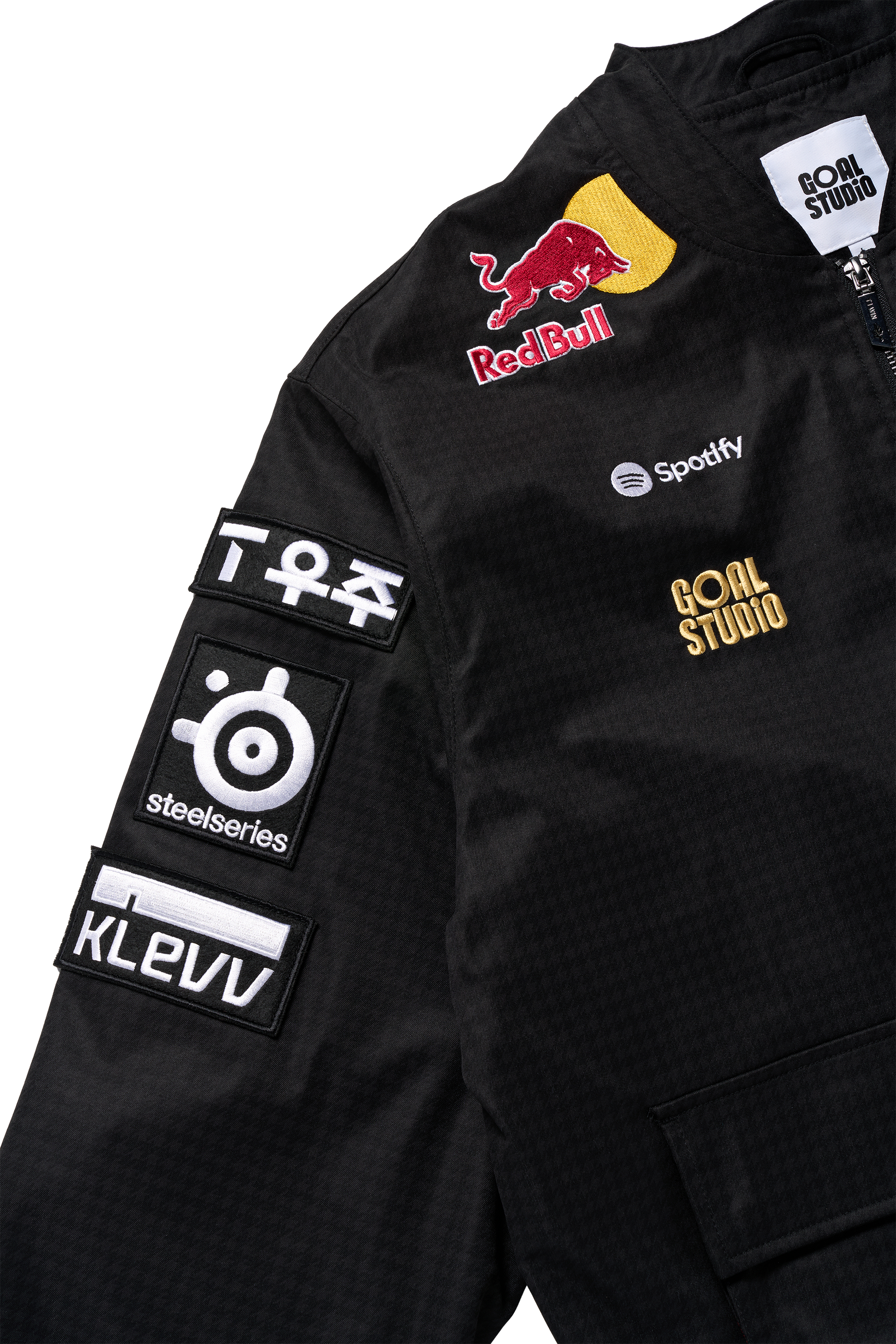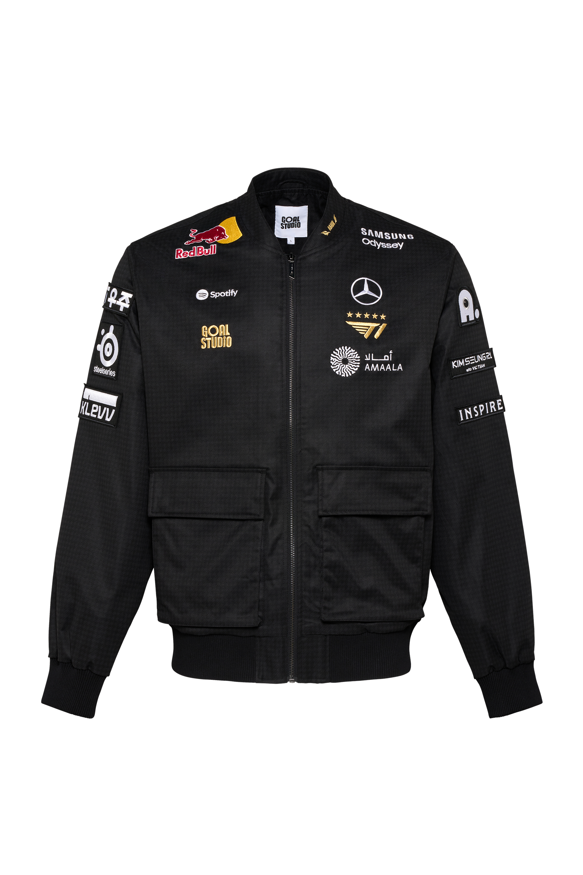 The 2025 T1 Worlds Uniform Jacket embodies the pride and legacy of champions. Designed by GOAL STUDIO, this sleek black bomber-style jacket celebrates T1’s dominance with intricate embroidered sponsor logos and the golden five-star crest, honoring world titles in Los Angeles, Berlin, Seoul, London, and the latest 2024 triumph.
