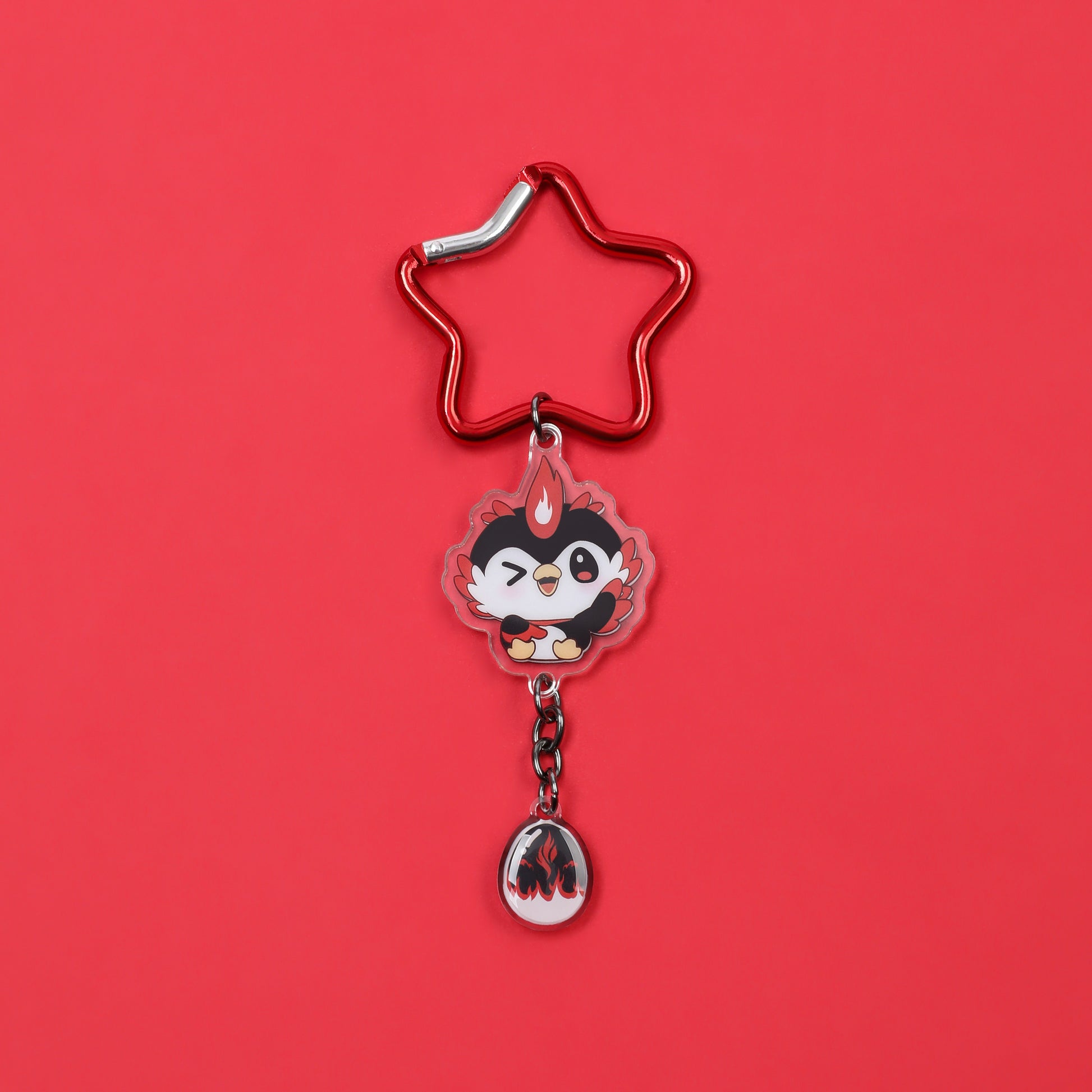 Made with a sturdy metal carabiner and durable acrylic charms, it’s both stylish and functional. The playful design includes a winking ATI charm and a flame accent charm that move freely on a short chain, adding extra charm and motion wherever you clip it.